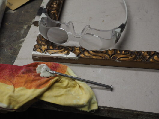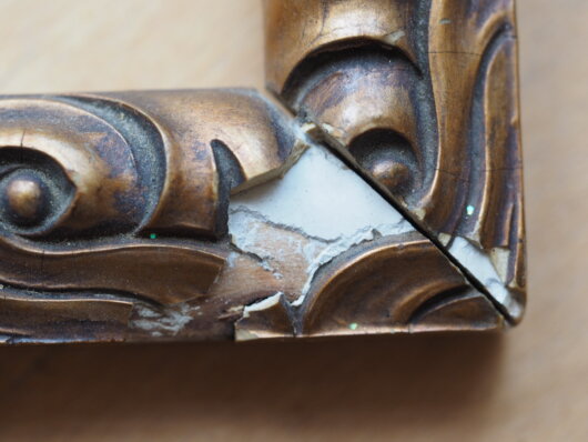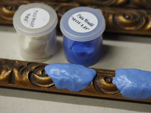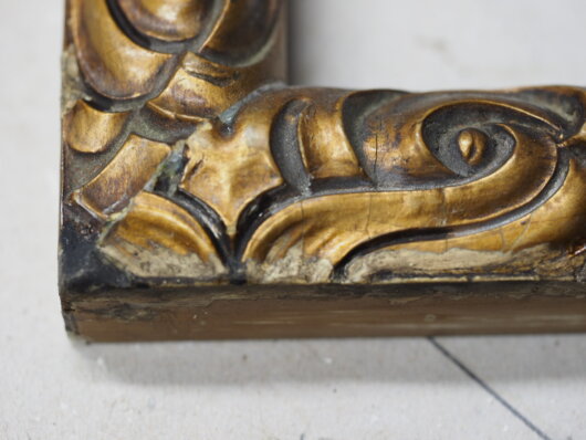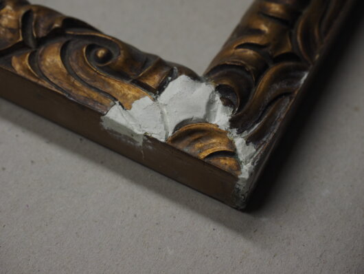Zum erneuten Aufbau der Profile werden in unbeschädigten Bereichen Silicon-Abdrücke genommen und aus Gips Positive hergestellt. Nach Austrocknung können diese dann in die größeren Defektbereiche eingepasst werden. Bei den vielen kleinen Abplatzungen ist die Rekonstruktion mit Gips nicht erfolgversprechend, so dass hier mit lufttrocknender Modelliermasse gearbeitet wird. Hiermit lassen sich die kleineren Profildefekte in guter Festigkeit rekonstruieren. Die Bilderrahmenseiten werden verleimt und mit einer Klammer rückseitig gesichert (nicht historisch korrekt). Die Eckbereiche können jetzt mit Modelliermasse weiter angepasst werden.