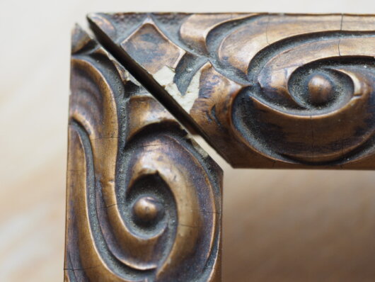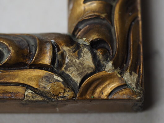 Der Rahmen fällt bei der Annahme zur Restauration durch seine extreme Instabilität auf. Die Gehrungsschnitte sind jeweils nur durch einen, nicht mehr festsitzenden Nagel gesichert. Beim Anheben des Rahmens scheint dieser bereits in seine einzelnen Leisten zu zerfallen. Mehrere Abplatzungen der Stuckverzierung vervollständigen den negativen Eindruck.