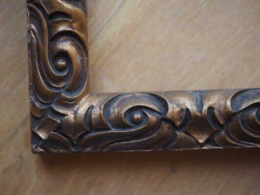 Nach der Aushärtung und einer ersten Farbauftragung zeigt sich bereits eine sehr wirkungsvolle Anpassung. Für die Vergoldung habe ich verschiedene Abtönungen von Goldpaste auf Wachsbasis besorg. So lässt sich auch der dunklere, leicht rötliche Goldton gut mischen und die Rekonstruktion des Goldrahmens kann zufriedenstellend abgeschlossen werden.