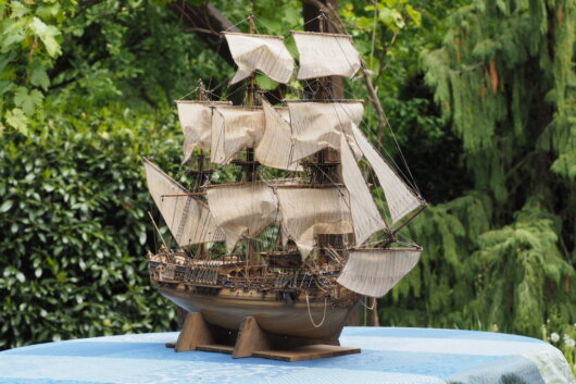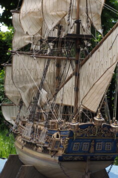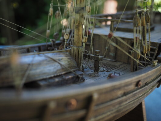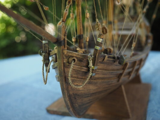 Nach zwei Jahren Bauzeit, zugegeben mit einigen Unterbrechungen (Pastellmalerei, Anfertigung von 10 Standstaffeleien, komplette WC Renovierung, Austausch von tragenden Carport-Balken, Pastell-Workshop in Berlin…) ist das Holzmodell endlich fertig. Das Modell stellt die königliche Yacht der Royal Caroline von 1750 dar (Fa. Mantua, Maßstab 1:47, Länge 830mm). Nach vielen, teils kniffligen Holzarbeiten, Berücksichtigung von Alterungsprozessen, Einbau von ca. 250m Takelage-Garn in unterschiedlichen Dicken und weit über 1000 Knoten konnte der Bau des Modells abgeschlossen werden. Als Besonderheit habe ich einen neuen Modell-Ständer angefertigt. Das Modell zeigt einen Dreimaster aus dem Jahre 1750. Das Holz des Ständers stammt aus der Pfahlgründung des Müllerhauses der Gustorfer Mühle und ist Eichenholz aus dem Jahre 1749!