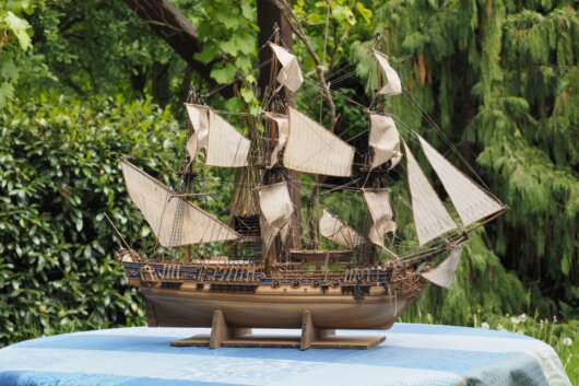 Zum Abschluss der Arbeiten erhielt das Modellschiff eine Glasvitrine, damit es nicht über die Jahre in eine zunehmende Staubschicht gehüllt wird.