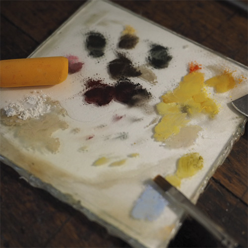 Die genaue Abstimmung eines exakten Farbtons während einer Restauration ist eine anspruchsvolle Aufgabe. Bei einem kleinen Farbspektrum ist sehr viel Erfahrung erforderlich. Farbmischungen gehören nicht zur Stärke oder einem notwendigen Repertoire eines Pastellmalers. Die geradezu unendliche Anzahl bereits vorliegender Farbabstufungen von Pastellen ist ein Vorteil, der ausgenutzt werden kann. Auf einer kleinen Glasplatte habe ich von Farbstiften kleine Pigmentmengen mit einem Messer abgeschabt und direkt daneben zwei Tropfen Leinöl aufgetragen. Durch sehr gründliches Einrühren verschiedener Pigmente tastet man sich an den gewünschten Farbton heran. Liegen tiefere Defekte vor, muss vor dem Farbauftrag der substanzielle Defekt ausgefüllt werden. Als Füllmasse dient eine Mischung aus Leinöl und Champagnerkreide, welche nach Durchtrocknung farblich der Umgebung angepasst werden kann. Auf diese Art und Weise lassen sich auch Oberflächenstrukturen wie Spachteltechniken nachempfinden und abgeplatzte Bereiche von Ölfarbe kaschieren.