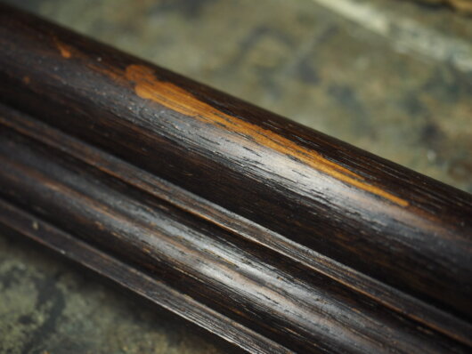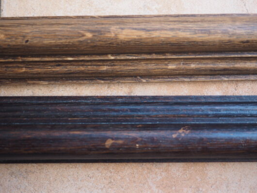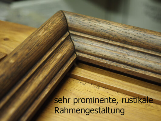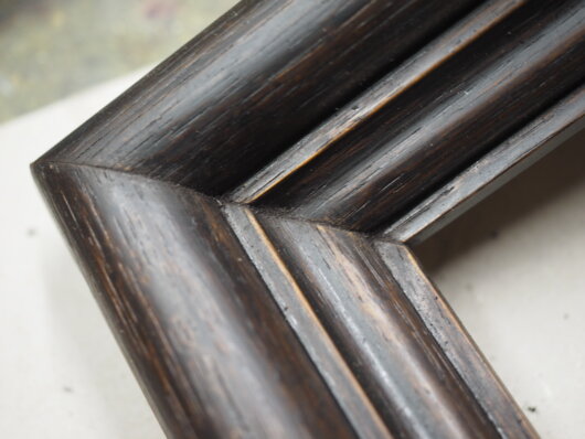 Die an den Farbdefekten aufgetragene Kitt Masse bedarf einer längeren Trocknungszeit. Diese Zeit wird ausgenutzt, um die Restaurierung des Rahmens zu beginnen. An dem Rahmen werden vorsichtig die mit Nägeln abgesicherten Eckverbindungen gelöst. Die fleckige Farbe des Rahmens wird in der Oberfläche mit Stahlwolle abgetragen. Nach Beendigung dieses Arbeitsschrittes zeigt sich ein sehr ansprechender Eichenholzrahmen. Der hellere, sehr rustikal wirkende Bildrahmen zieht den Blick direkt auf sich und raubt dem Bild Aufmerksamkeit. Folglich fällt die Entscheidung, dem Rahmen sein unruhiges Erscheinungsbild durch eine gleichmäßige Abdunkelung wieder zu nehmen. Dies wird durch die Auftragung einer dunklen Mahagoni Holzlasur erreicht. Eine Beimischung schwarzen Ruß-Pigmentes verstärkt den Effekt. Die so vorbereiteten Rahmenteile können dann im Spannrahmen verleimt werden. Zur Sicherung habe ich auf der Rückseite Rahmenheft-Klammern eingebracht (nicht historisch korrekt). Kleinere Spaltbildungen durch nicht passgenaue Gehrungsschnitte können verspachtelt werden. Auch hier kommen Künstlerpigmente wieder zum Einsatz. Durch die Beimischung von schwarzem Ruß und Sepiabraun kann der Holzkitt farblich gut angepasst werden.