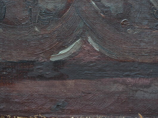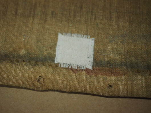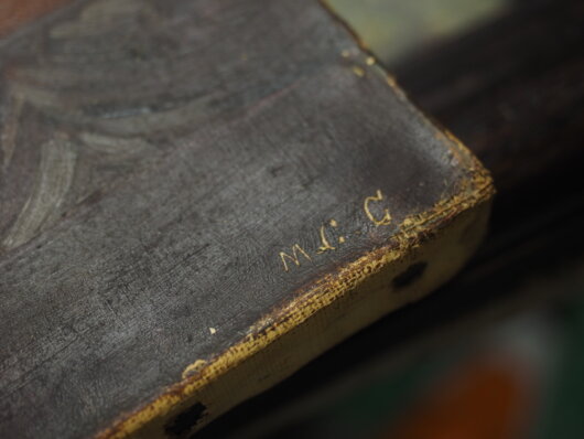 Das Ölbild wird zunächst aus dem Rahmen gelöst. Eine unter dem Falz versteckte Künstler-Signatur kommt zum Vorschein. Die Buchstaben M.C. G. wurden in die noch feuchte Ölfarbe eingekratzt. Ebenfalls lässt sich jetzt erst ein kleiner Defekt in der Leinwand erkennen. Dieser ist durch einen zwischen Leinwand und Spannrahmen hereingefallenen Nagel verursacht worden.
