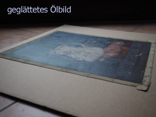 Aufgrund der nicht mehr gleichmäßig gespannten Bildleinwand wird dieses vom Spannrahmen gelöst. Das Leinengewebe wird auf der Rückseite gleichmäßig angefeuchtet und für mehrere Stunden zwischen glatten Flächen gepresst. Es folgt die Säuberung des Ölbildes mit Wattepads und schmutzlösenden Lösungsmitteln. Der Erfolg der Glättung ist auch nach mehreren Tagen unverändert vorliegend, so dass zunächst der kleine Leinwanddefekt (Durchstoßung eines Nagelkopfes) von der Rückseite durch einen Leinwandflicken geschlossen wird. Die Bereiche der Ölfarbenabplatzungen werden von der Vorderseite zunächst durch eine Kitt Masse (gereinigtes Leinöl, Champagnerkreide) geschlossen. Dieser Verbindung wurde etwas Terpentinersatz (Testbenzin) beigefügt. Hierdurch wird die Trockenzeit etwas verkürzt und entspricht der Regel in der Ölmalerei („mager auf fett“). Zur besseren Anpassung wurden dieser Füllmasse Farbpigmente beigemischt (Abschabungen von Pastellkreiden). Dadurch erfolgte bereits eine erste farbliche Anpassung. Die Leinwand konnte erneut auf den Spannrahmen fixiert werden. Dieser Holzrahmen ist nicht, wie heute üblich, ein nachspannbarer Keilrahmen, sondern eine feste Rahmengröße.