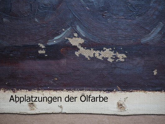 Bei der ersten Betrachtung des Bildes fallen direkt mehrere Abplatzungen von Ölfarbe im unteren Bildbereich auf. Im rechten oberen Eckbereich ist die Bildleinwand deutlich gewellt. Die dunkle Farbe des Rahmens ist an mehreren Stellen abgegriffen. Die Eckverbindungen sind mit kleinen Spalten ungenau angelegt. Die Befestigung ist, wie bei den alten Rahmen sehr häufig, gelockert und nur mit Nägeln durchgeführt.