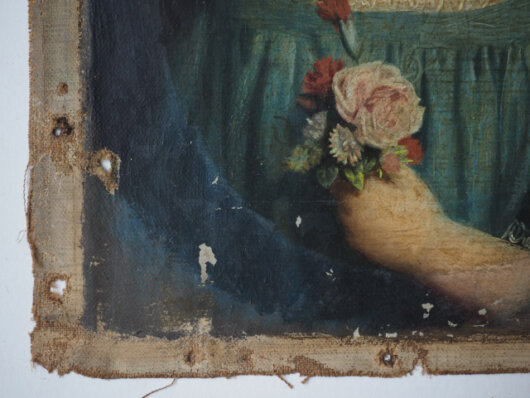 das Leinengewebe des Werkes in einem sehr schlechten Zustand. Im Randbereich,