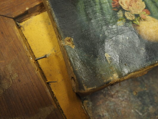 Die randständigen Leinwanddefekte wurden durch Nagelköpfe