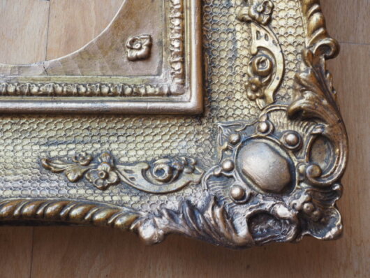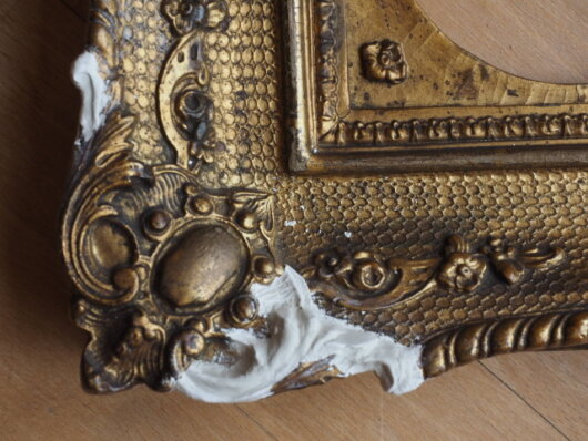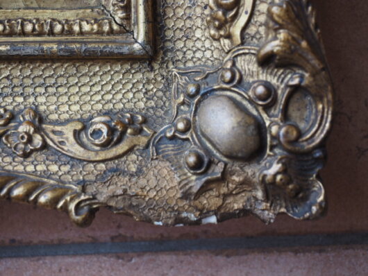 größere Abplatzungen der Stuckverzierung auf. Am rechten Rahmen sind Defekte an