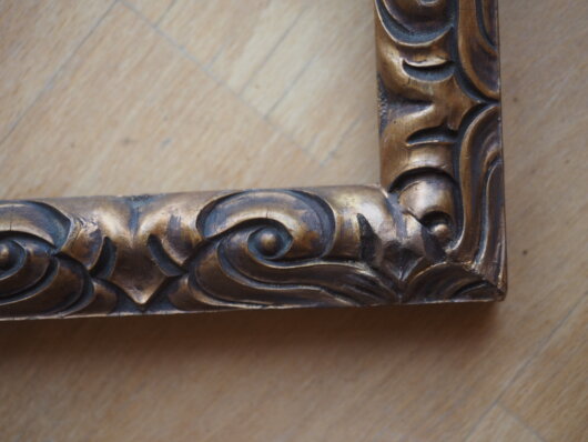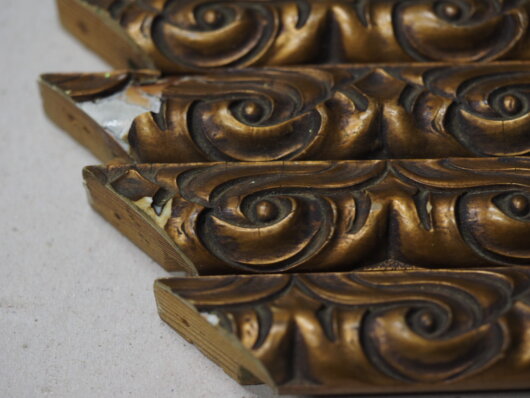 Zum erneuten Aufbau der Profile werden in unbeschädigten Bereichen Silicon-Abdrücke genommen und aus Gips Positive hergestellt. Nach Austrocknung können diese dann in die größeren Defektbereiche eingepasst werden. Bei den vielen kleinen Abplatzungen ist die Rekonstruktion mit Gips nicht erfolgversprechend, so dass hier mit lufttrocknender Modelliermasse gearbeitet wird. Hiermit lassen sich die kleineren Profildefekte in guter Festigkeit rekonstruieren. Die Bilderrahmenseiten werden verleimt und mit einer Klammer rückseitig gesichert (nicht historisch korrekt). Die Eckbereiche können jetzt mit Modelliermasse weiter angepasst werden.