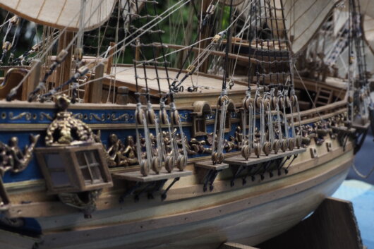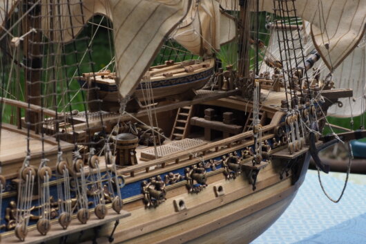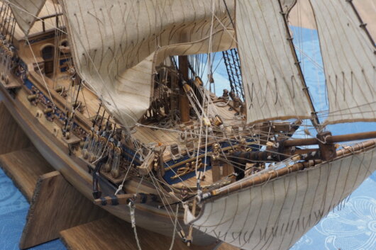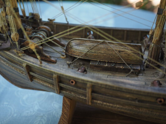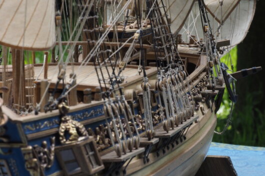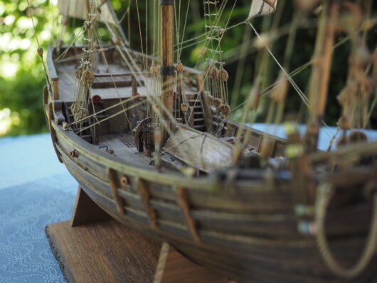 Nach zwei Jahren Bauzeit, zugegeben mit einigen Unterbrechungen (Pastellmalerei, Anfertigung von 10 Standstaffeleien, komplette WC Renovierung, Austausch von tragenden Carport-Balken, Pastell-Workshop in Berlin…) ist das Holzmodell endlich fertig. Das Modell stellt die königliche Yacht der Royal Caroline von 1750 dar (Fa. Mantua, Maßstab 1:47, Länge 830mm). Nach vielen, teils kniffligen Holzarbeiten, Berücksichtigung von Alterungsprozessen, Einbau von ca. 250m Takelage-Garn in unterschiedlichen Dicken und weit über 1000 Knoten konnte der Bau des Modells abgeschlossen werden. Als Besonderheit habe ich einen neuen Modell-Ständer angefertigt. Das Modell zeigt einen Dreimaster aus dem Jahre 1750. Das Holz des Ständers stammt aus der Pfahlgründung des Müllerhauses der Gustorfer Mühle und ist Eichenholz aus dem Jahre 1749!