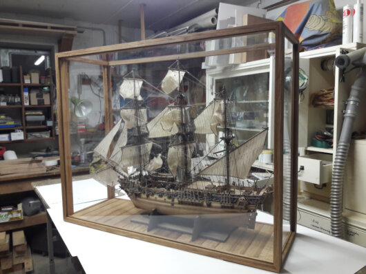 Zum Abschluss der Arbeiten erhielt das Modellschiff eine Glasvitrine, damit es nicht über die Jahre in eine zunehmende Staubschicht gehüllt wird.
