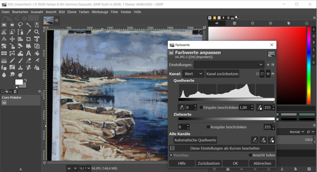 Gimp (siehe unten): nach Öffnen des Bildes auf Farbe/Werte gehen.