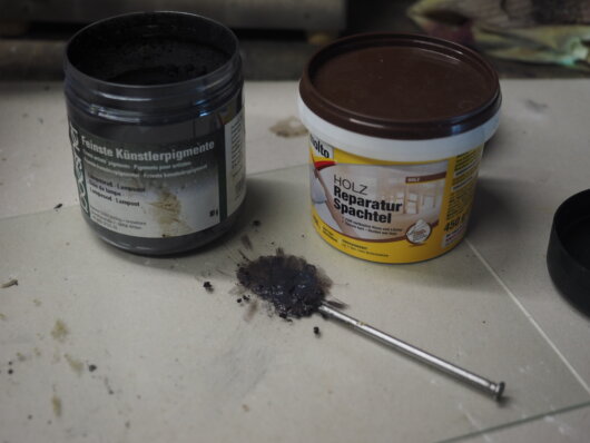 Nach Austrocknung der Strukturpaste werden die Bereiche nochmals mit Ölfarbe angepasst. In gereinigtes Leinöl mit etwas Terpentin verdünnt werden die Farbpigmente eingemischt - von Softpastellen abgeschabt. Die beiden Bilder sind aufnahmebedingt im Farbspektrum nicht vergleichbar.