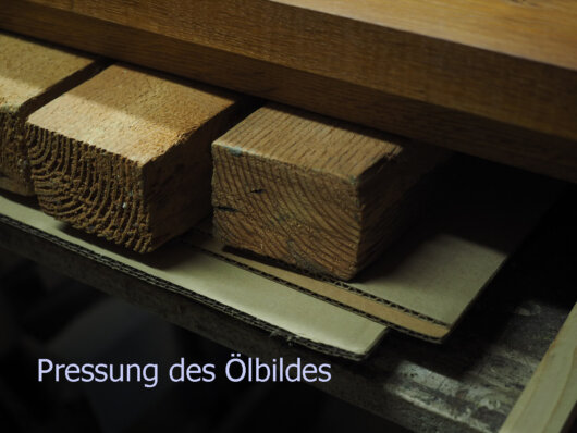 Aufgrund der nicht mehr gleichmäßig gespannten Bildleinwand wird dieses vom Spannrahmen gelöst. Das Leinengewebe wird auf der Rückseite gleichmäßig angefeuchtet und für mehrere Stunden zwischen glatten Flächen gepresst. Es folgt die Säuberung des Ölbildes mit Wattepads und schmutzlösenden Lösungsmitteln. Der Erfolg der Glättung ist auch nach mehreren Tagen unverändert vorliegend, so dass zunächst der kleine Leinwanddefekt (Durchstoßung eines Nagelkopfes) von der Rückseite durch einen Leinwandflicken geschlossen wird. Die Bereiche der Ölfarbenabplatzungen werden von der Vorderseite zunächst durch eine Kitt Masse (gereinigtes Leinöl, Champagnerkreide) geschlossen. Dieser Verbindung wurde etwas Terpentinersatz (Testbenzin) beigefügt. Hierdurch wird die Trockenzeit etwas verkürzt und entspricht der Regel in der Ölmalerei („mager auf fett“). Zur besseren Anpassung wurden dieser Füllmasse Farbpigmente beigemischt (Abschabungen von Pastellkreiden). Dadurch erfolgte bereits eine erste farbliche Anpassung. Die Leinwand konnte erneut auf den Spannrahmen fixiert werden. Dieser Holzrahmen ist nicht, wie heute üblich, ein nachspannbarer Keilrahmen, sondern eine feste Rahmengröße.