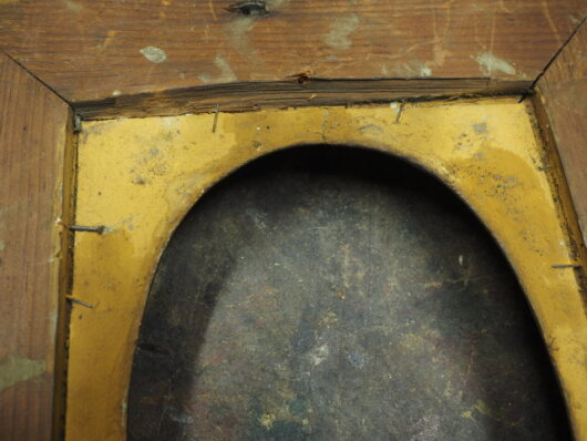 Des Weiteren ist erwähnenswert, dass die beiden Portraits nicht eindeutig für die hier vorliegenden Rahmen gedacht waren. Die beiden Ölbilder haben unterschiedliche Maße und wurden zur optimalen Platzierung in den ovalen Ausschnitt sehr asymmetrisch eingebracht. So wurde die Rahmenfalz an der Unterseite deutlich vergrößert. Der ovaläre Abdruck auf dem Bild ist nicht mittig platziert.