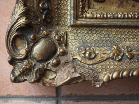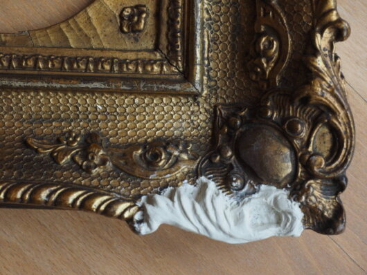 größere Abplatzungen der Stuckverzierung auf. Am rechten Rahmen sind Defekte an